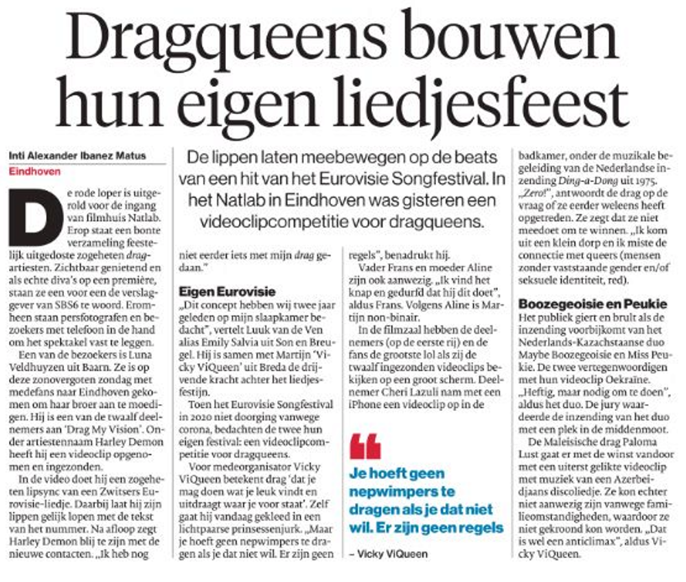 During the live show of Drag-My-Vision at Natlab, Eindhoven, the Dutch television show Hart van Nederland was present. Miss Peukie and Maybe took this as a chance to display some of their activism. Sadly the words of Miss Peukie were left out of the final video, but we enjoy her presence on the background! That must be quite radical on National Television.