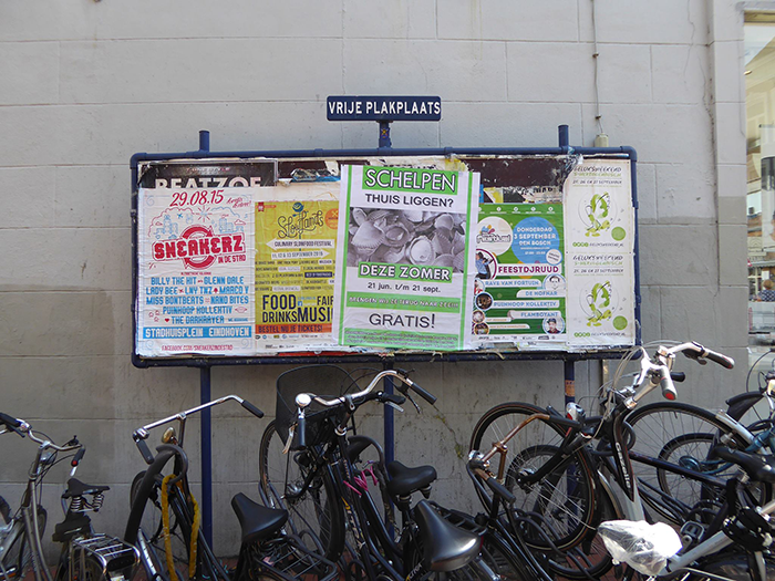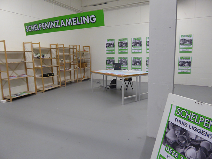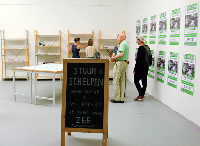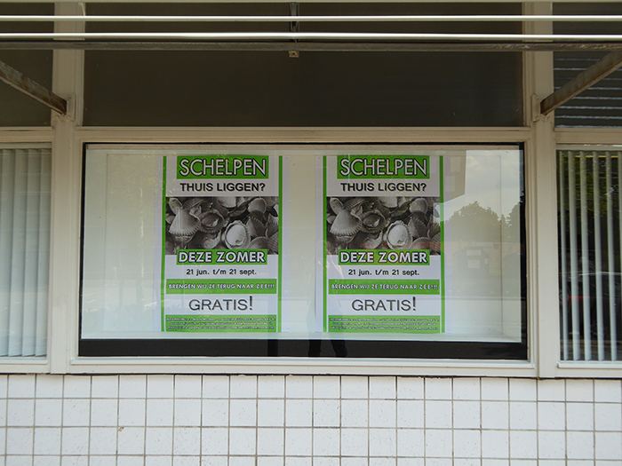 In the summer of 2015 we organised a marketing campain to collect shells with the intention to bring them back to the sea. We distributed posters in public spaces and created three collecting points. One at the graduation show of AKV St. Joost Den Bosch, one at Jeroen Bosch Ziekenhuis and one in an exhibition in Willem II Fabriek.