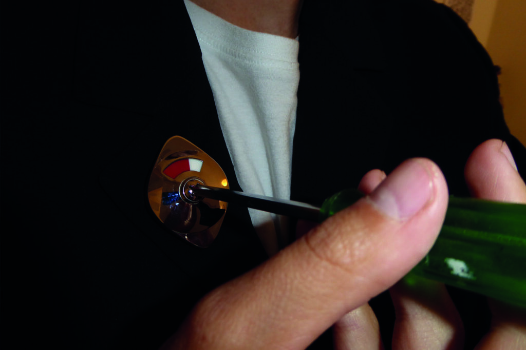 To accompany this we made a brooch from a toilet stall latch. The red and white colours shows our availability to help. A beautiful moment in making of this piece of jewelry was during the purchase of the closure in a store called Weijntjes. Gert-Jan, who worked there, was so enthusiastic that he helped us in the process of making this hardware a fashion piece.